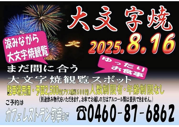 Home > お知らせ・イベント > 主な年間イベント > 大文字焼 有料席情報 2025.08.04 主な年間イベント 大文字焼 有料席情報 ◎大文字焼宿泊施設に泊まって観覧は、箱根強羅温泉旅館ホテル組合HPへ https://hakone-goraonsen.com/hotel/ 大文字焼開催に伴う ... 主な年間イベント一覧 8/16 箱根登山電... カテゴリー 主な年間イベント イベント情報 お知らせ 観光ガイド 強羅の歴史 ごうらん便り アーカイブ 月を選択... 2026年1月 (1) 2025年10月 (1) 2025年8月 (4) 2025年7月 (1) 2025年5月 (1) 2025年4月 (1) 2024年12月 (1) 2024年10月 (1) 2024年8月 (7) 2024年7月 (1) 2024年6月 (2) 2024年5月 (2) 2023年10月 (2) 2023年8月 (2) 2023年7月 (1) 2022年10月 (1) 2022年9月 (1) 2022年8月 (2) 2022年7月 (1) 2022年6月 (1) 2022年4月 (1) 2021年10月 (1) 2021年9月 (2) 2019年4月 (1) 2016年4月 (2) 2015年12月 (1) 2015年11月 (1) 2015年4月 (1) 2015年3月 (1) 2014年6月 (1) 2014年5月 (5) 2014年4月 (1) 2014年3月 (2) 2014年2月 (1) 2012年2月 (5) 2012年1月 (1) SPOT施設一覧 温泉・ホテル 食べる・飲む 見る・買う 遊ぶ 保養所